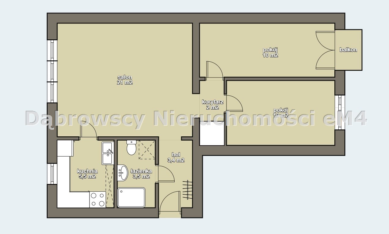 Układ pomieszczeń: strefę dzienną stanowi salon z przejściem do kuchni oraz niewielkiego korytarzyka, z którego wejdziesz do dwóch sypialni, ponadto korytarz oraz łazienka z kabiną prysznicową.