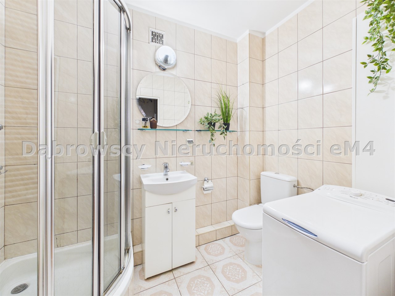 Łazienka: Kompaktowa i przemyślana – z prysznicem, WC oraz wygospodarowanym miejscem na pralkę i szafkę.