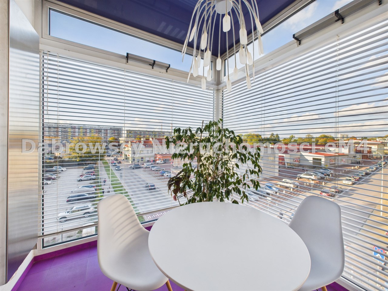 Przeszklone patio zamiast balkonu – niecodzienne rozwiązanie z dużymi panoramicznymi oknami, które oferują widok na zadbane osiedle i wpuszczają mnóstwo naturalnego światła.