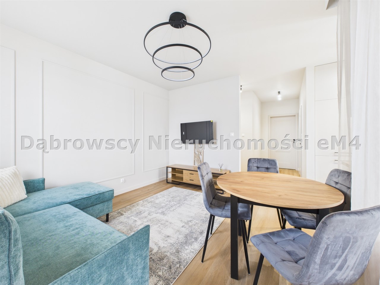 • jasny salon z wygodną strefą wypoczynkową i wyjściem na balkon,