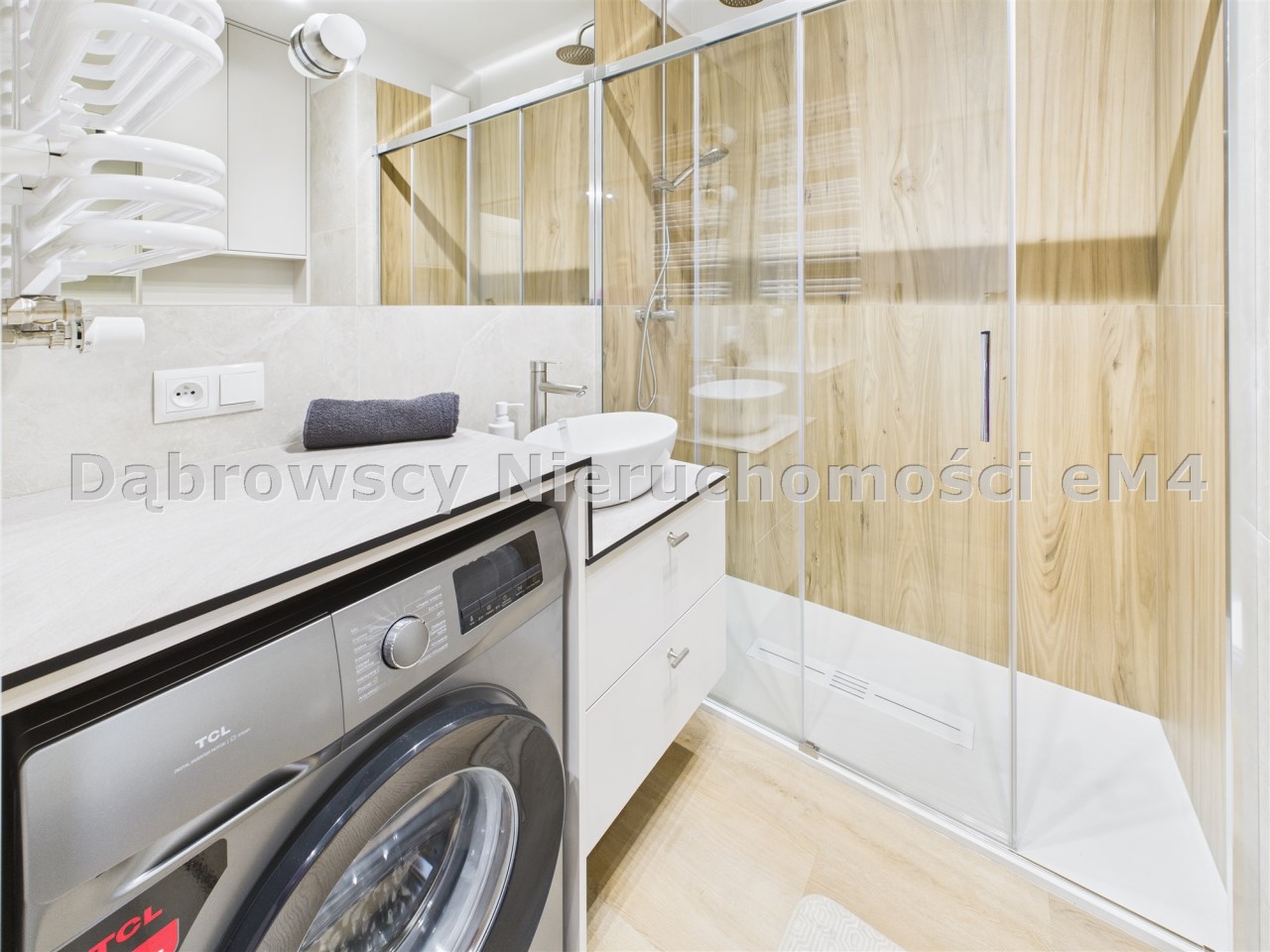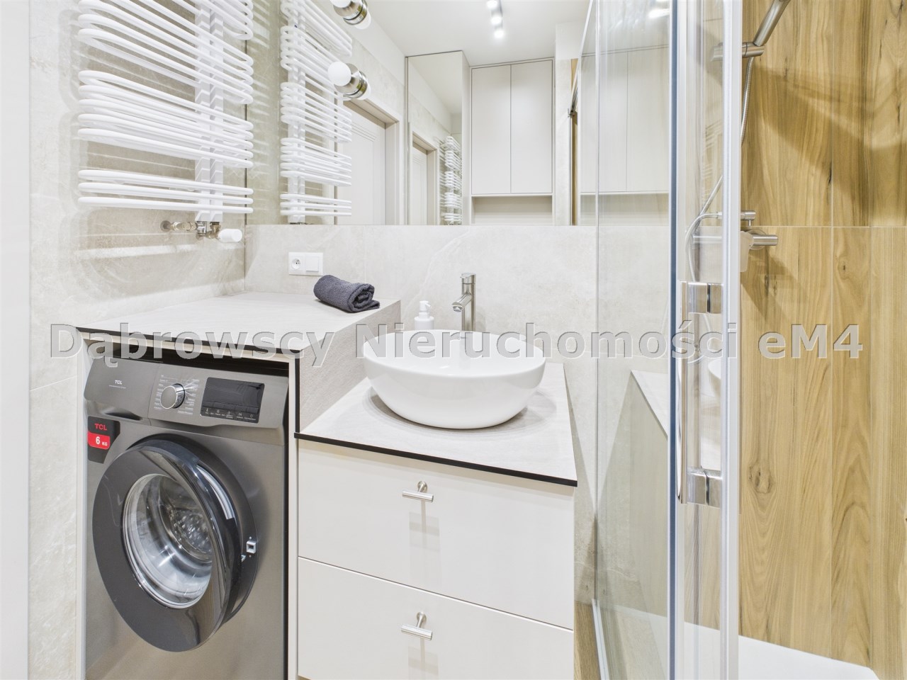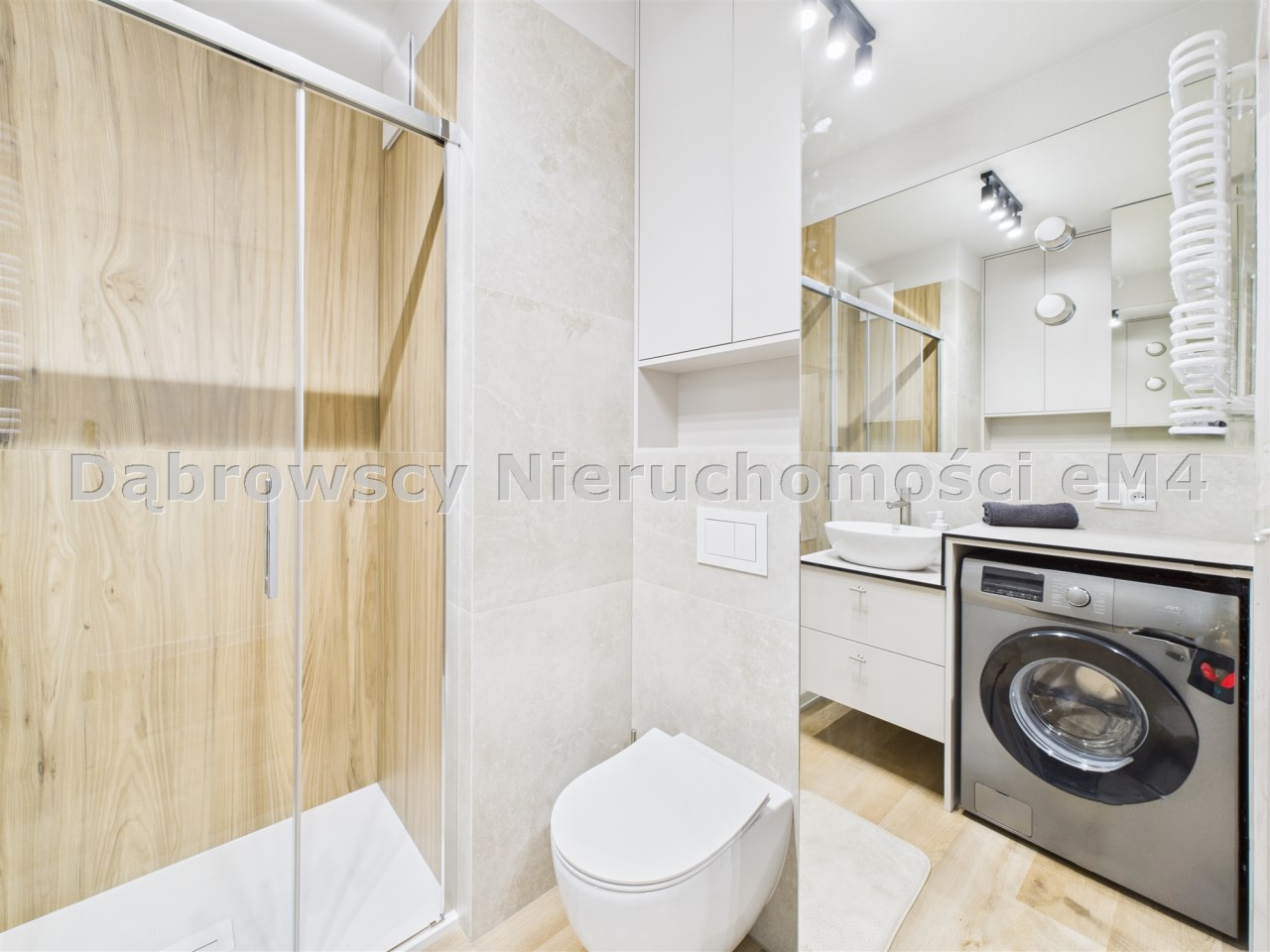 • łazienka z kabiną prysznicową i zabudową na wymiar, pralka